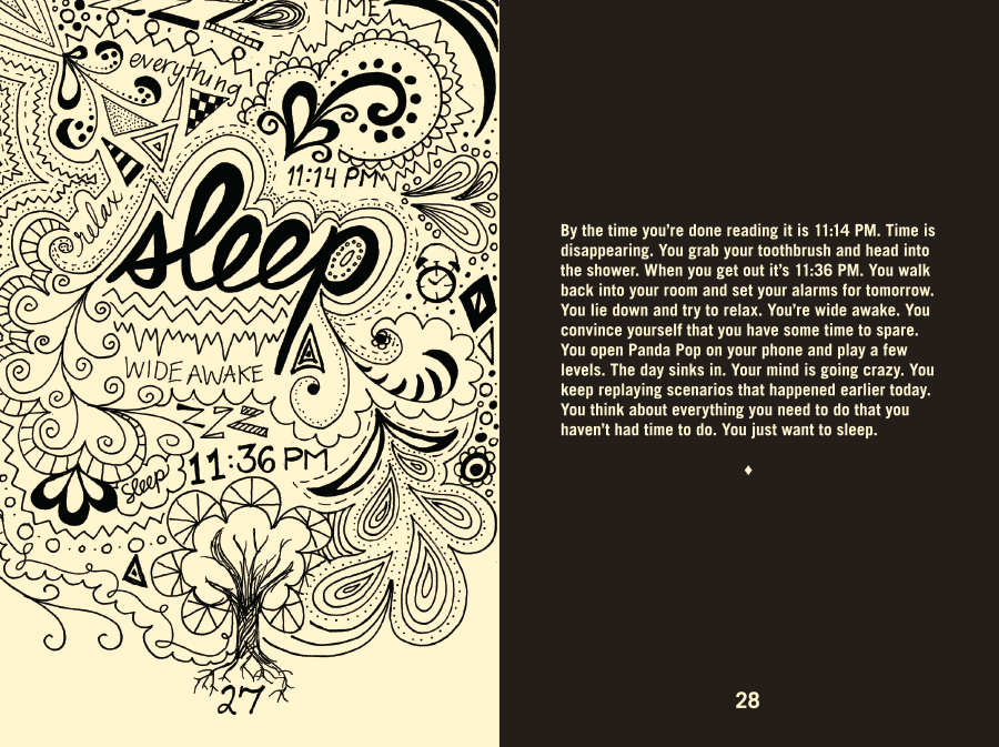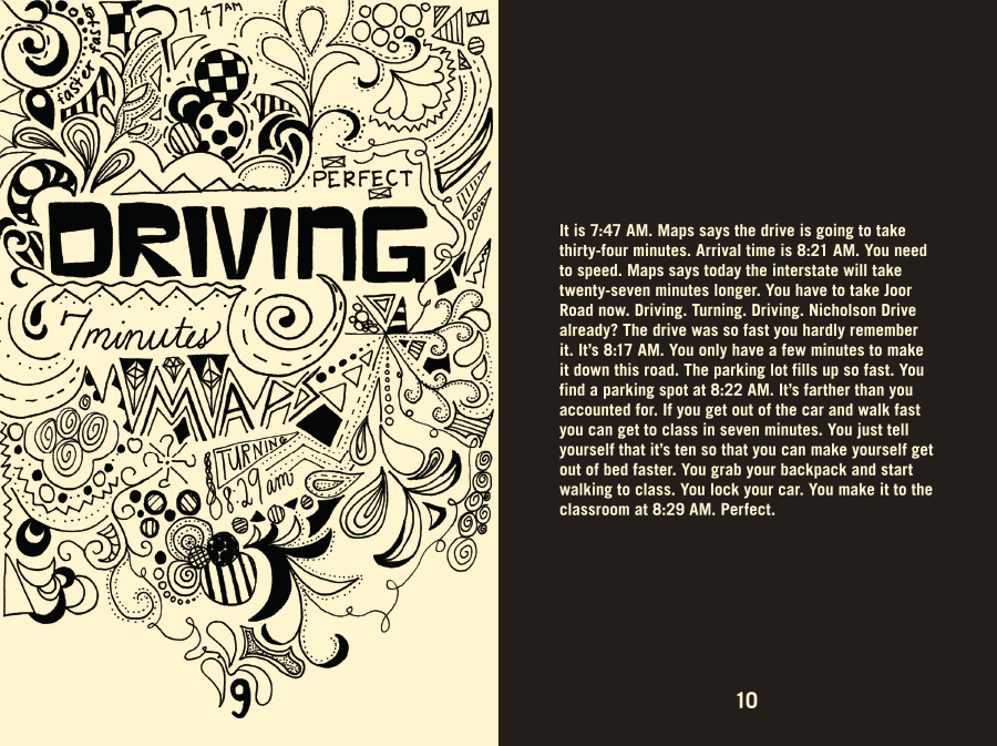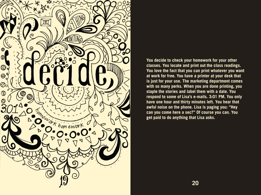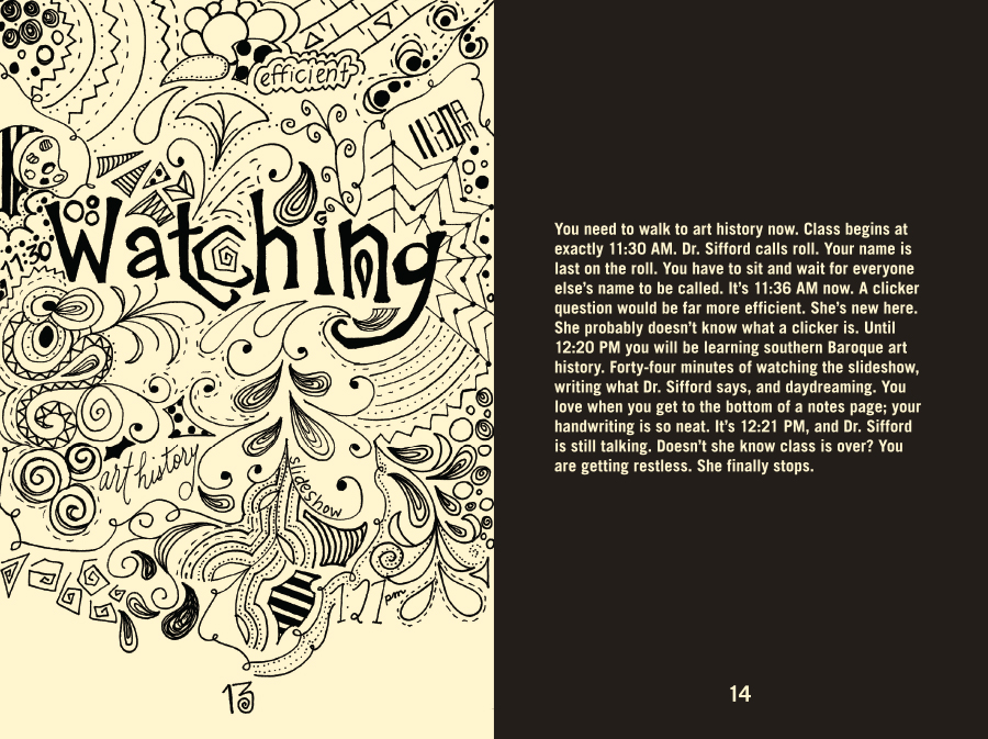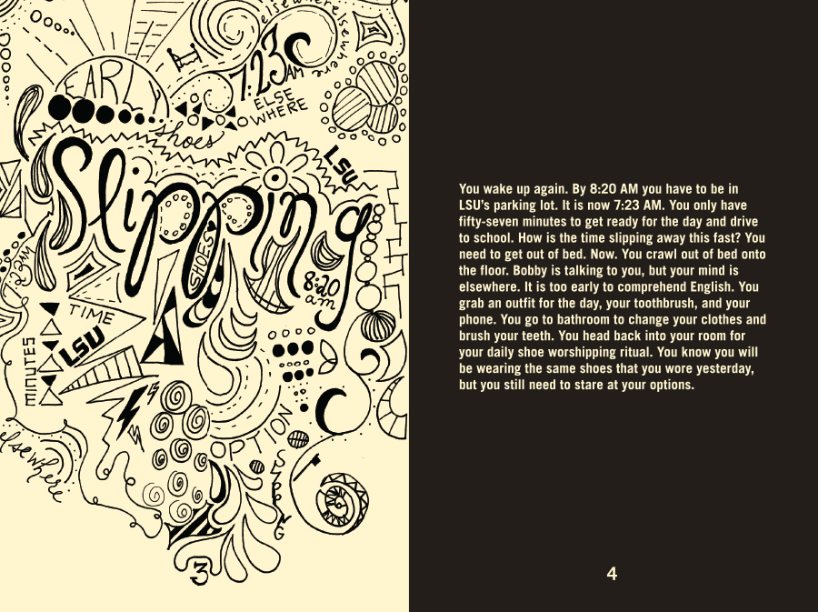 The Life You Were Given, 32 pages not including the cover, was printed and assembled by hand. The book descriptively narrates my thoughts for a day in my life during my senior year at LSU. The left-hand pages feature hand-drawn illustrations that portray the feelings expressed on their corresponding right-hand pages.